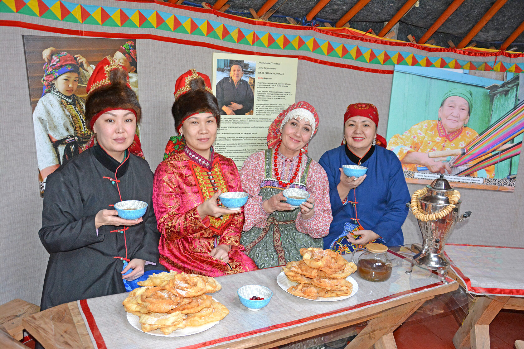 Телеуты нас радушно встречали в этнографическом парке «Шан Туу Jерим» по древней традиции с веселыми песнями. Столы были накрыты разной выпечкой, среди которой красовалась царица телеутских угощений – катама (хворост). Поставив в центр стола самовар, представители русской и телеутской национальностей стали обмениваться знаниями о чаепитиях своего народа.