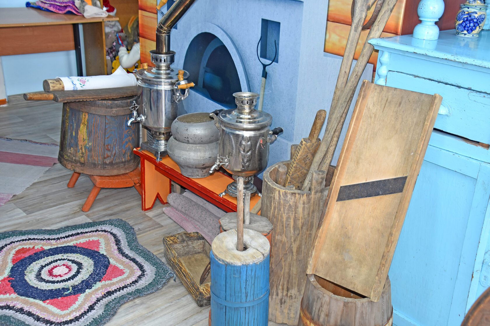 Сама собой родилась идея создать комнату казачьего быта, а по сути, воспроизвести уклад жизни простого трудового человека, какими были наши предки 50-100 лет назад. Экспонаты для музея собирали всем селом. Сюда селяне несли старые кувшины, половики, покрывала, валенки, чугунки. Здесь есть прялка, корыто, самовары, старые буфеты и даже маслобойка, которой, по подсчетам Юрия Михайловича, не меньше ста лет! Красный угол для комнаты отведен иконам. Главная среди них – икона Николая Чудотворца, покровителя казаков. Есть старые иконы, они не столько ценны в смысле культурного достояния, сколько намолены несколькими поколениями селян. Юрий Михайлович и Елена Викторовна ими очень дорожат.